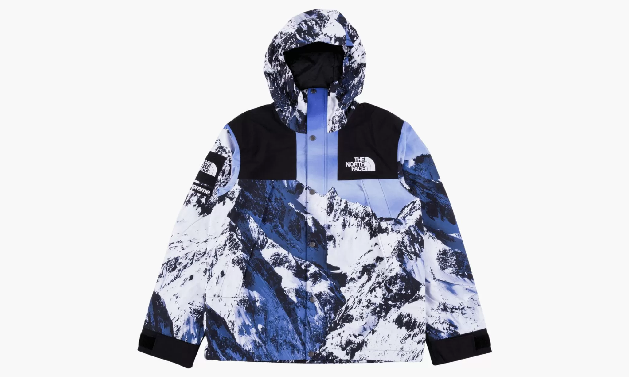 The Supreme x The North Face Mountain Parka is a grail-worthy outerwear piece from two iconic players within the streetwear scene. Snow-covered mountains cover the entire nylon body, sleeves and hood of the parka. Color blocked black shoulders with white embroidered The North Face branding on the left shoulder contrasts the look. Dual branded The North Face and Supreme patches appear on the right shoulder. The North Face x Supreme Mountain Parka was released during Supreme's Fall/Winter 2017 season.